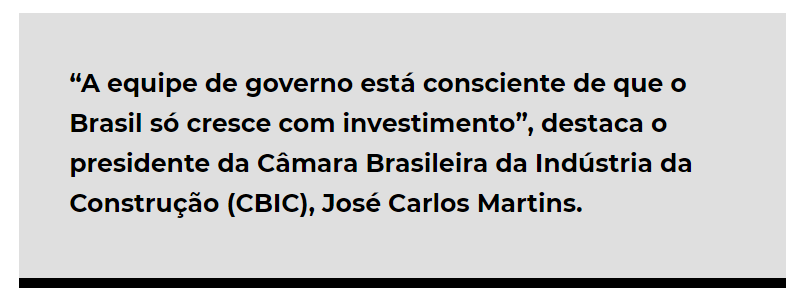 Um novo ciclo de crescimento para ser sustentável obrigatoriamente precisará do comprometimento recíproco dos governos e da cadeia produtiva da construção em promover ações e investimentos de forma continuada.
