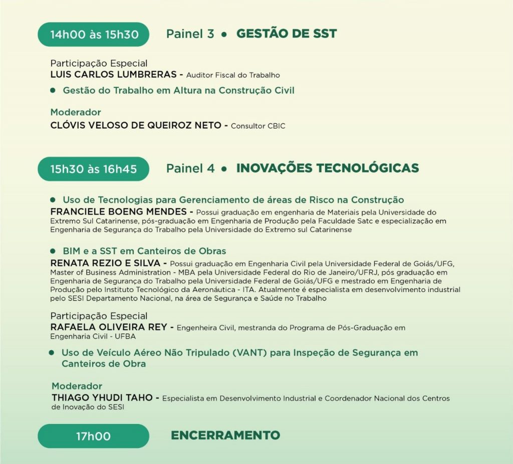 Além disso, também será lançada a CANPAT Construção ciclo 2019/2020. De iniciativa da CBIC, a Campanha Nacional de Prevenção de Acidentes na Indústria da Construção (CANPAT Construção) combina esforços com os principais atores da Segurança e Saúde do Trabalho: o Sesi, os Serviços Sociais da Indústria da Construção (Seconcis) e a Secretaria de Trabalho do Ministério da Economia. Seu objetivo é induzir ainda maior redução na incidência de acidentes na indústria da construção e tornar o ambiente de trabalho cada vez mais produtivo e seguro.
