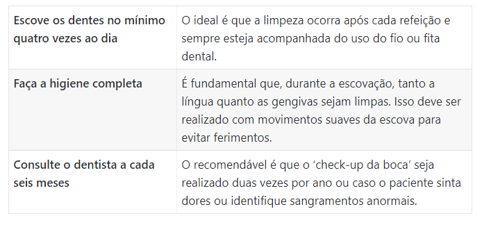O acúmulo de placa bacteriana é uma das consequências da não escovação e a principal causa de doenças gengivais. Segundo a dentista Mariana Cristina Penteado Huet do Seconci-SP, é normal que ao longo do dia bactérias se acumulem na parte inferior dos dentes, formando uma película aderente próxima à gengiva. “Esses microrganismos são removidos com a limpeza dos dentes e uso do fio dental regularmente. Porém, quando a pessoa não realiza a higiene diariamente, essa placa pode liberar substâncias que levam às enfermidades”, explica. As doenças gengivais se desenvolvem em três etapas e os principais sintomas são inchaço e retração das gengivas, mau hálito, gosto ruim na boca e dor durante a mastigação. Na primeira fase, a gengiva fica avermelhada e sangra durante a escovação ou com o uso do fio dental. Já no segundo estágio, conhecido como periodontite, há um recuo do músculo que envolve o dente, permitindo o avanço da placa bacteriana em direção à raiz da dentição.