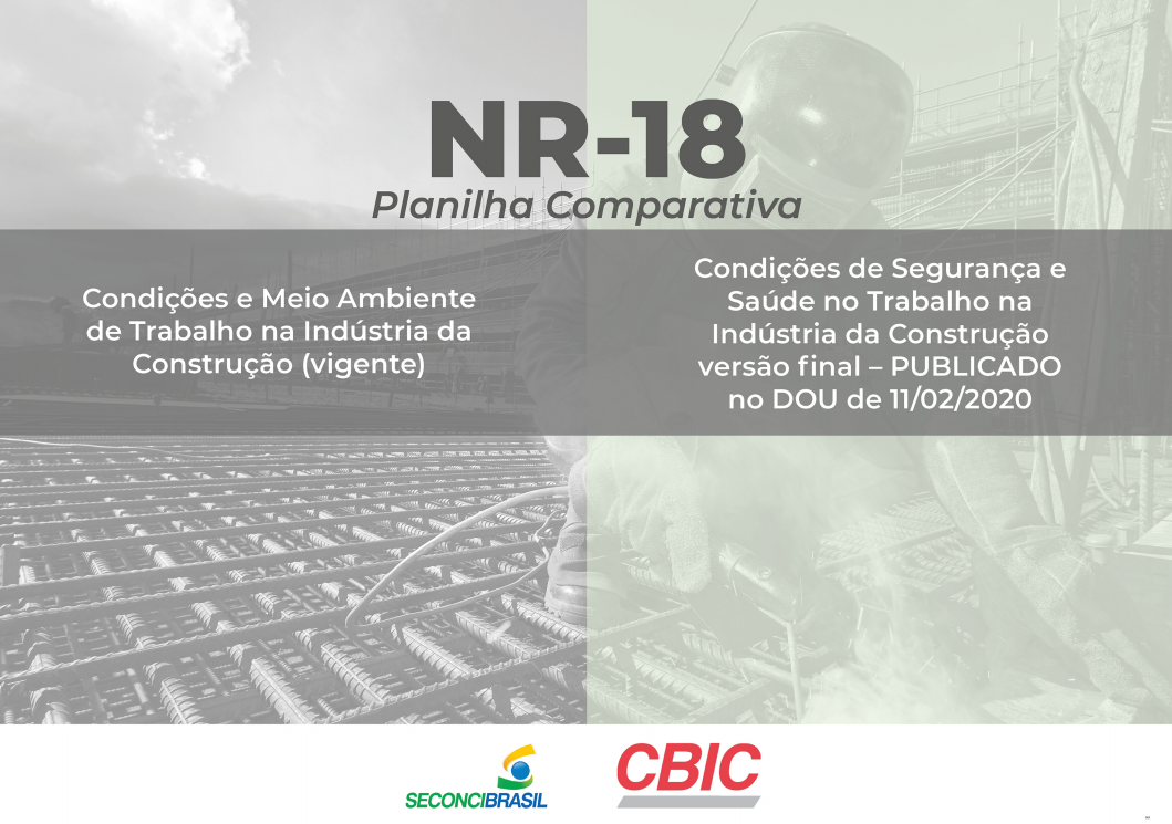 A Câmara Brasileira da Indústria da Construção (CBIC), em parceria com a Associação Seconci-Brasil, elaborou planilha comparativa entre a Norma Regulamentadora nº 18 (NR 18) vigente e a nova – Condições e Meio Ambiente de Trabalho na Indústria da Construção (vigente) e Condições de Segurança e Saúde no Trabalho na Indústria da Construção versão final – publicada pela Secretaria Especial de Previdência e Trabalho do Ministério da Economia no Diário Oficial da União (DOU) de 11 de fevereiro deste ano.