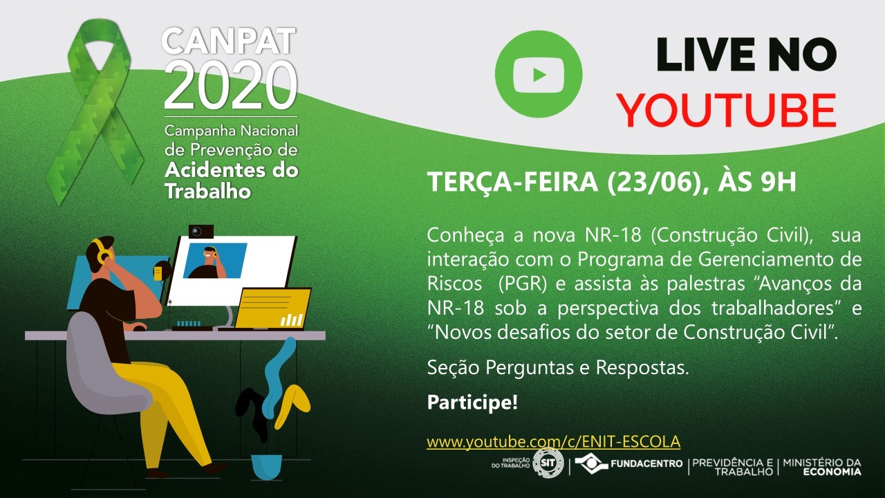 Empresários e profissionais do setor da construção podem participar no próximo dia 23 de junho, a partir das 9h, de live da Campanha Nacional de Prevenção de Acidentes do Trabalho (CANPAT 2020) – Especial NR-18, onde será realizada uma seção de perguntas e respostas sobre a Norma Regulamentadora nº 18. A transmissão
