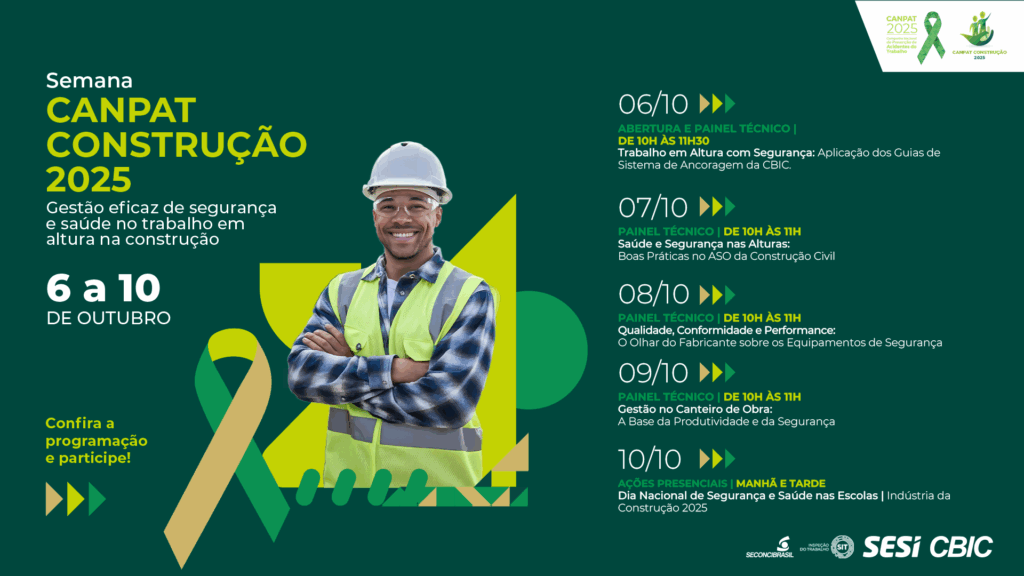 De 6 a 10 de outubro, será realizada a Semana CANPAT Construção 2025, que este ano traz como tema “Gestão eficaz de segurança e saúde no trabalho em altura na construção”. A programação inclui atividades virtuais, como palestras e debates, além de ações presenciais.