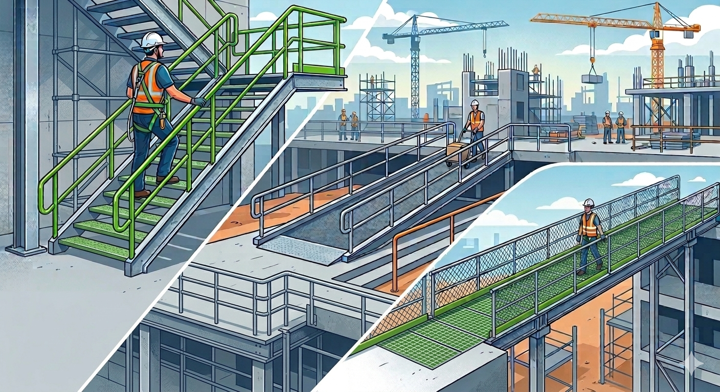 Escadas, rampas e passarelas são superfícies destinadas ao trânsito de pessoas, equipamentos e materiais nas frentes de trabalho da construção civil. A definição do tipo adequado depende do ângulo de inclinação em relação à superfície horizontal, da frequência de uso, da finalidade do acesso e das características das atividades executadas.