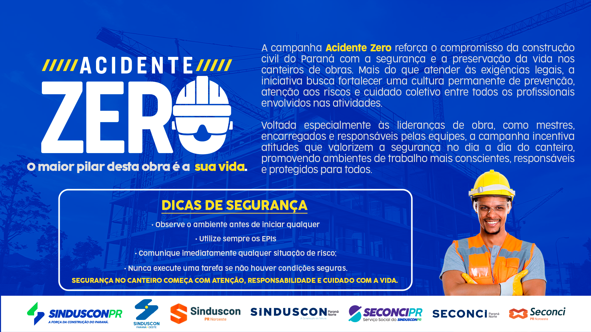 Foi lançada oficialmente a campanha ACIDENTE ZERO, uma iniciativa conjunta dos Sinduscons e Seconcis do Paraná, criada com o objetivo de fortalecer a cultura de saúde e segurança no trabalho nos canteiros de obras em todo o estado.