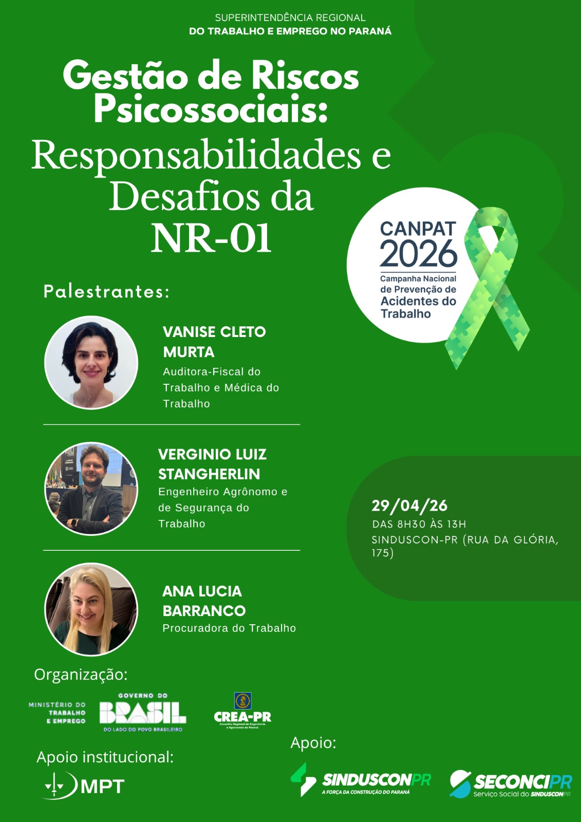 A programação tem início às 8h30, com abertura institucional que contará com representantes da Superintendência Regional do Trabalho, do Ministério Público do Trabalho, do CREA-PR, do Sinduscon-PR e do Seconci-PR. Na sequência, especialistas irão conduzir apresentações sobre o papel do CREA na gestão dos riscos psicossociais e as diretrizes do Ministério do Trabalho sobre o tema. Após o intervalo, o seminário segue com a participação do Ministério Público do Trabalho e, ao final, uma mesa-redonda reúne os palestrantes para debate e troca de experiências.